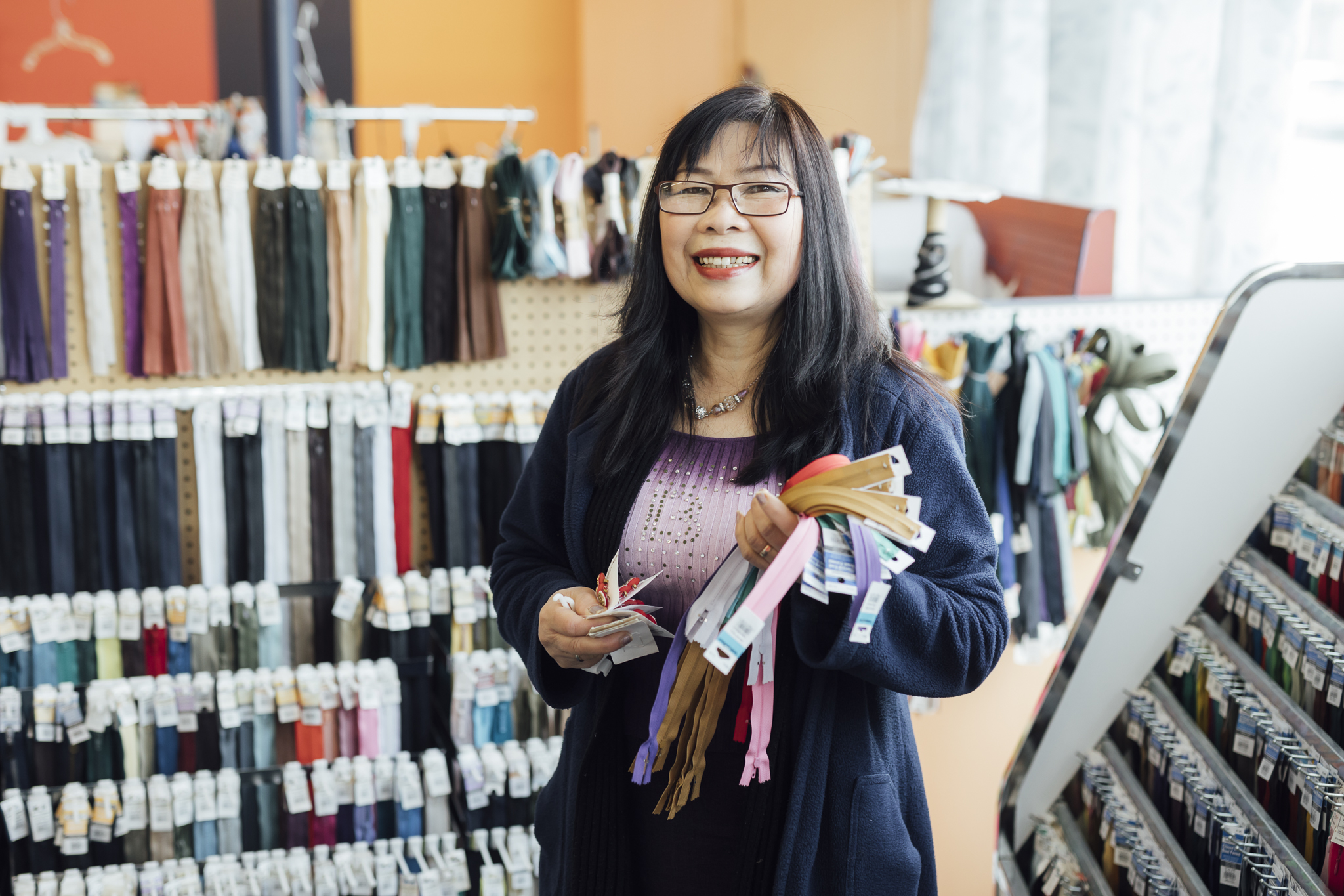 While tailoring services are at the core of the business, Designs by Nhung has grown in scope. The store now boasts a wide inventory of sewing supplies and fabrics, including quilting materials, upholstery fabrics, and floral prints. “I have a little bit of everything really,” she says. “I get really happy when customers come looking for something that’s hard to find, and I have it, so they don’t have to travel or shop online to get it.”